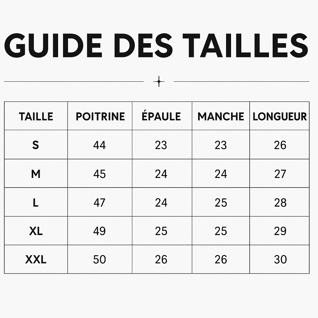 Si vous hésitez entre deux tailles, nous vous recommandons de choisir la taille au-dessus pour un ajustement plus confortable.